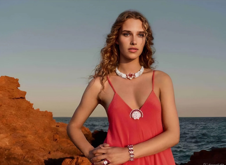 สร้อยคอ “มงกุฎใบปาล์ม” หรือ Palmeraie merveilleuse Necklace (บัลเมอแร แมรเวยเยอง) เส้นนี้ จุดประกายจินตนาการถึงพวงช่อใบปาล์มทิ้งตัวแผ่เป็นวงรัศมีอยู่บนยอดต้น
