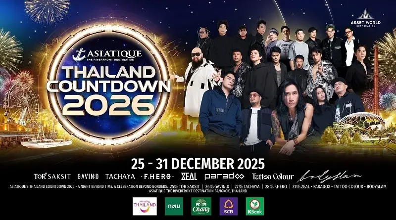 เอเชียทีค เดอะ ริเวอร์ฟร้อนท์ เดสติเนชั่น ภายใต้การบริหารงานของ แอสเสท เวิรด์ คอร์ปอเรชั่น (AWC) พร้อมด้วยพันธมิตร อาทิ การท่องเที่ยวแห่งประเทศไทย กรุงเทพมหานคร น้ำแร่ธรรมชาติตราช้าง ธนาคารไทยพาณิชย์ และ ธนาคารกสิกรไทย ผนึกกำลังจัดงาน “ASIATIQUE’s THAILAND COUNTDOWN 2026” สร้างสรรค์ประสบการณ์เฉลิมฉลองข้ามปีสุดยิ่งใหญ่ริมแม่น้ำเจ้าพระยา ครั้งแรกกับงานเคานต์ดาวน์ 5 วันเต็ม ตั้งแต่วันที่ 25 – 28 และ 31 ธันวาคม 2568